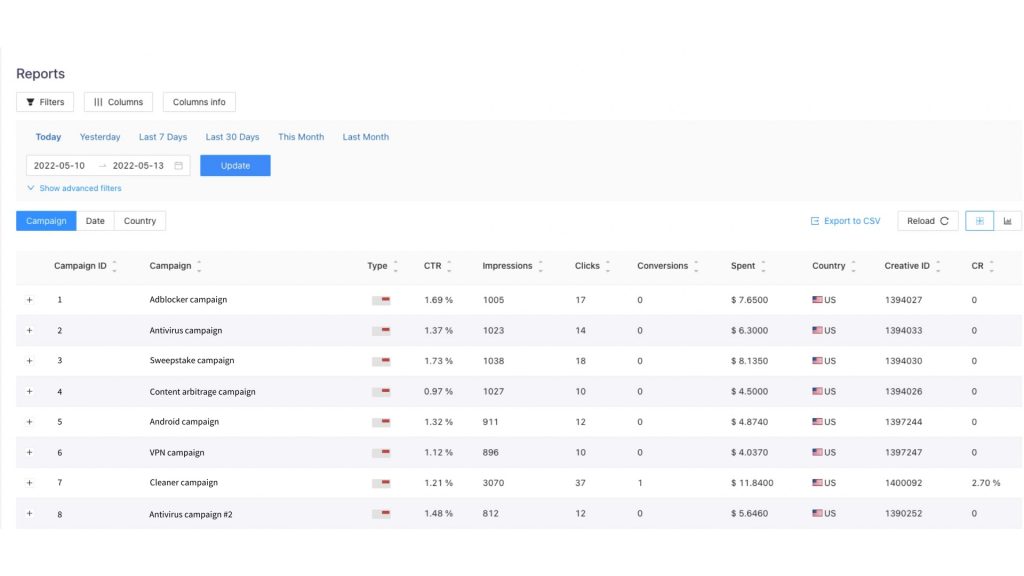 Besides 8 default columns, the user has added: CR, Creative ID and Country.