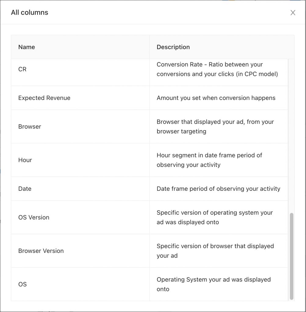 If you need column information and the meaning of those, you can always click on the columns info button, which will open a popup with all the explanations about columns.