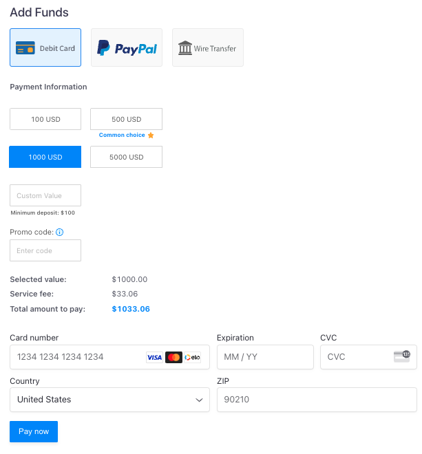 All you need to do to pay with Debit Card is to input all the necessary data and click “Pay Now”. Funds will be immediately visible on your account.