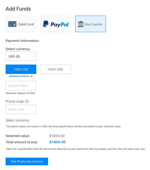 To pay via Wire Transfer, you need to put the amount you want to pay (minimum is $1000), and click on “Get Proforma Invoice”.