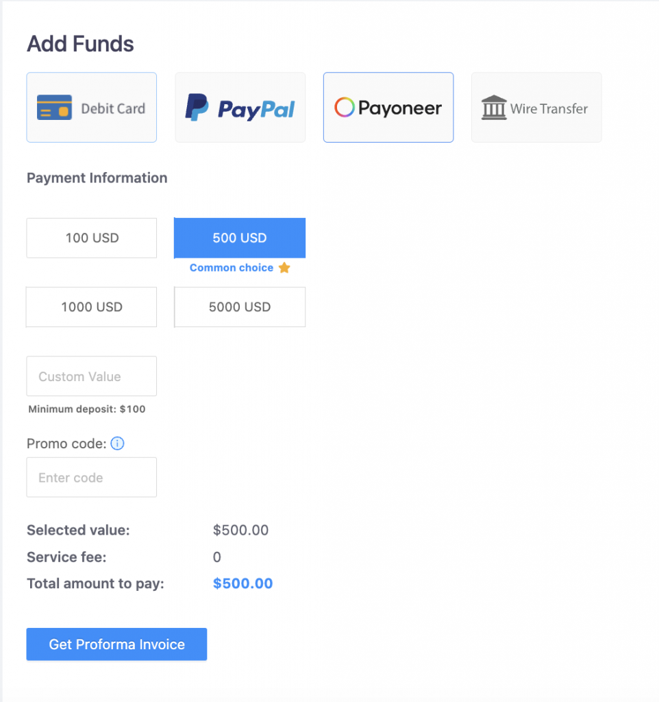 To pay via Payoneer, the procedure is almost the same as for Wire payments. Just put the amount you want to pay, and click on “Get Proforma Invoice”.