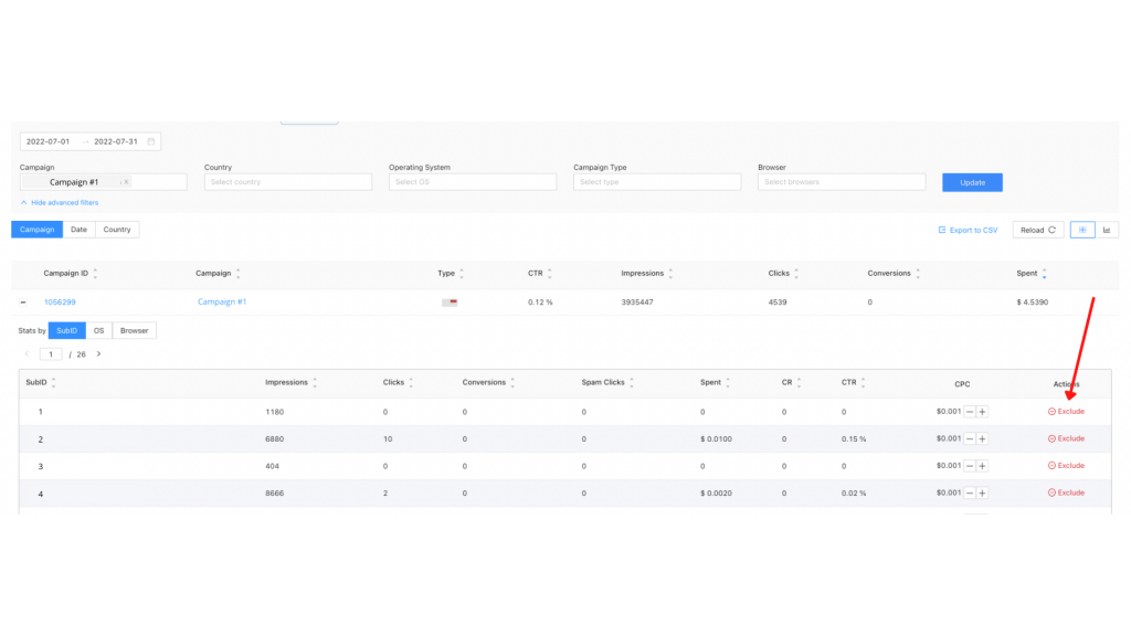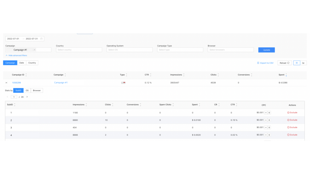 Excluding sources on our platform is actually a really easy task. All you need to is to Reports, and search for the campaign, you want to exclude sources from.