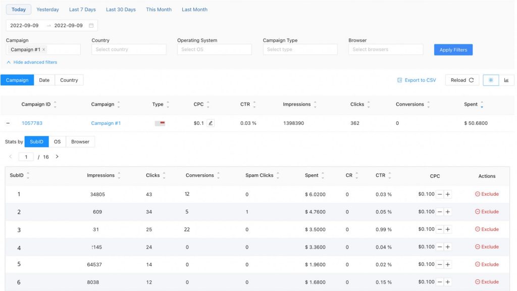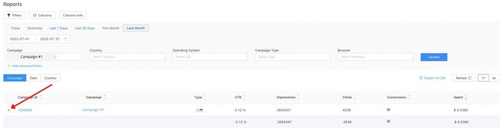 To do that, you must go to the “Reports” page, select a campaign you want to optimize sources, click on a small “+” sign to expand the column, and see all sources for your campaign.