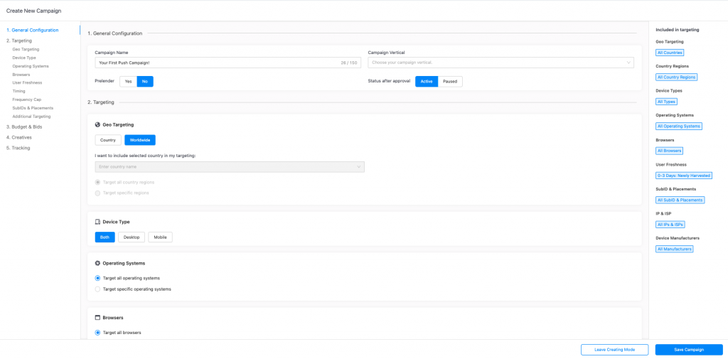 First, you need to enter the campaign name. Let’s call it: “Your First Push Campaign”.