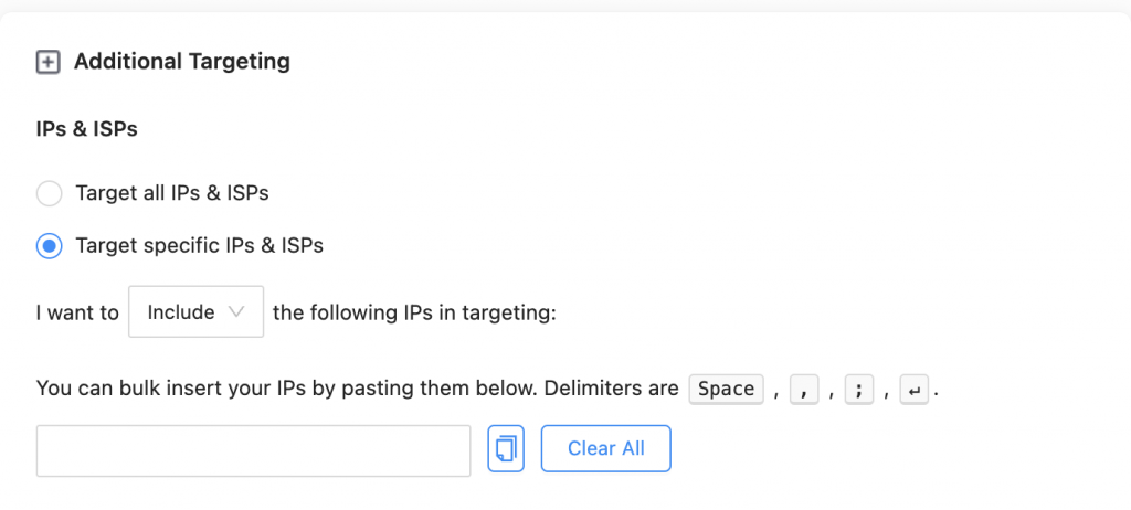 To do that, just click on “Target Specific IP & ISPs” and enter values you would like to target.