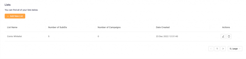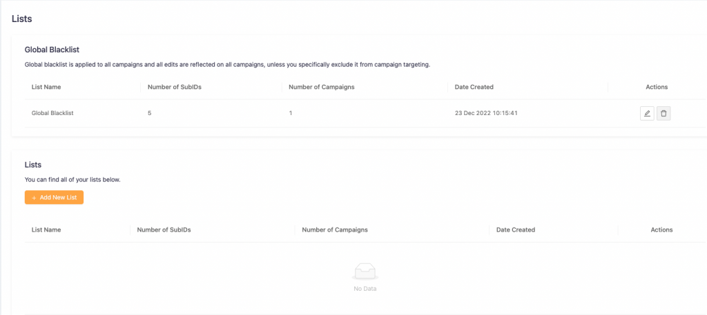 At the moment, we do not have any lists created. To create a list, just press “Add New List”.