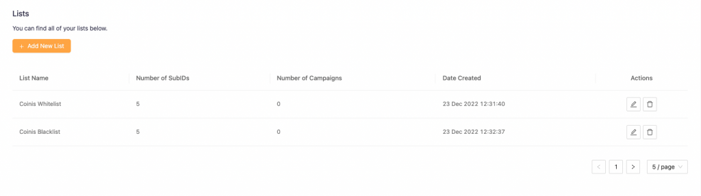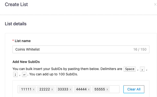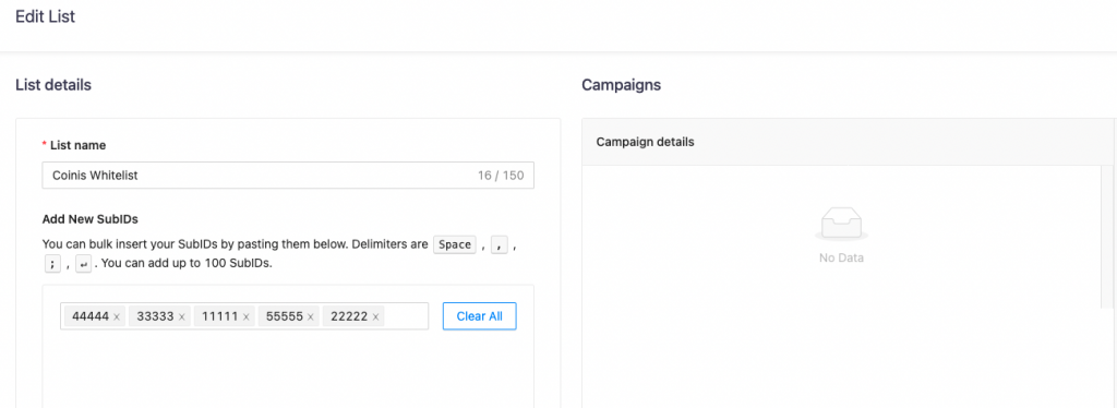 You want to create several whitelist campaigns with the sources included in Coinis WL. You don’t need to add those sources separately – all you need to do is to apply “Coinis WL” to each of those campaigns.