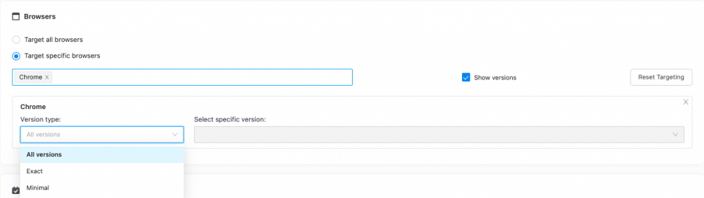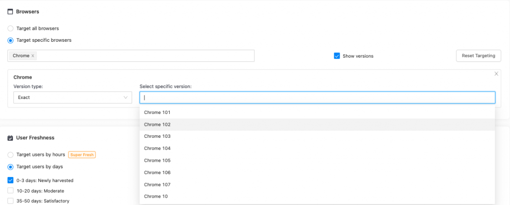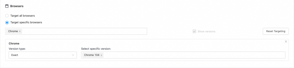 If you want to target specific Chrome versions, tick the “Show versions” button.