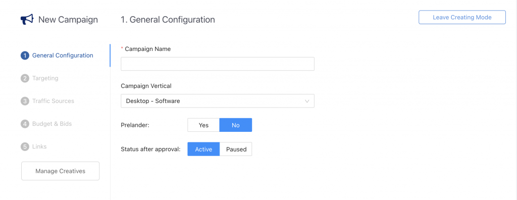 1. Under General Configuration, set a campaign name and select a vertical that matches your activities the best. Here, you can add a prelander if you want to, and configure the status of your campaign after the approval.