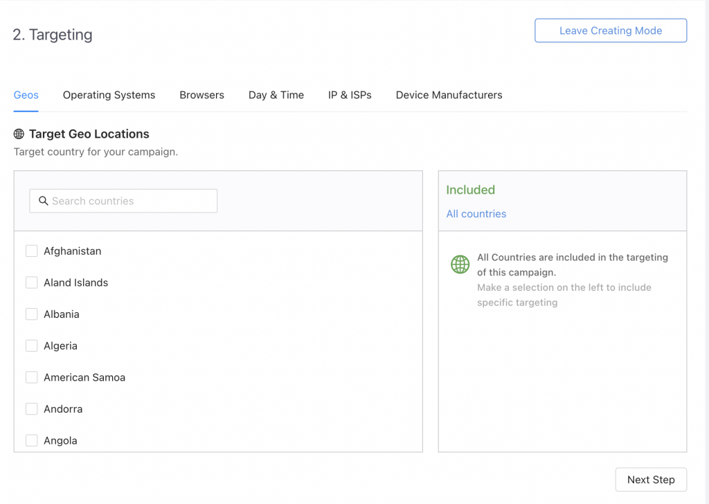 2. The Targeting section enables you to set geo-targeting, so you can select countries where your ads want to show. You can also configure the Operating Systems and browsers to which the ad will appear, which can be very helpful in optimizing campaigns.
