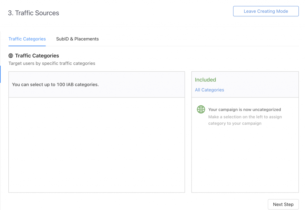 3. The traffic sources section lets you target users by specific traffic categories, from arts and entertainment. You can narrow this section if you know the exact traffic where your offers convert best. If you’re unsure, keep it wide by selecting up to 100 categories. Target users by specific SubIDs & Placements if you want to record and track unique user attributes, traffic sources, banners, and/or link placement.