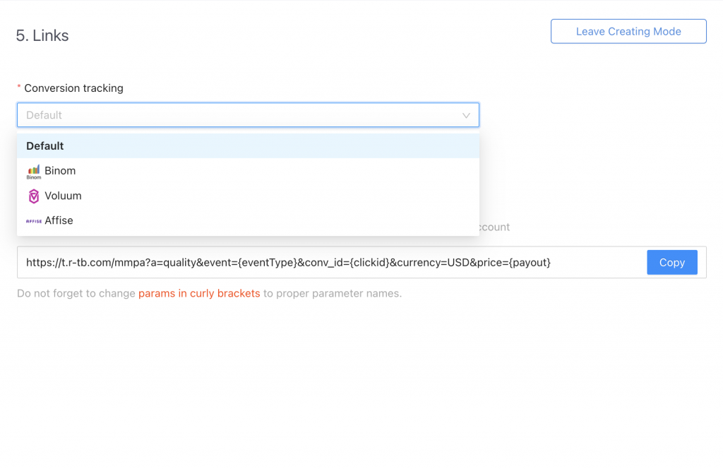 5. The last part of this section is where you choose your conversion tracking method. You can choose between Binom, Voluum, and Affise. After choosing a tracker, copy the link.