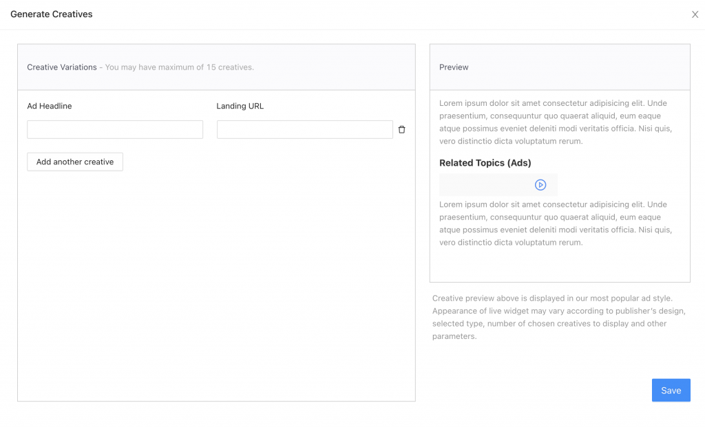 Once this section is done, proceed to Manage Creatives. You can have up to 15 creatives per campaign.