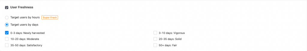 #1: If you target 0-3 days of user freshness, that means that you are targeting users who have subscribed for push notifications in the last 0 to 3 days.